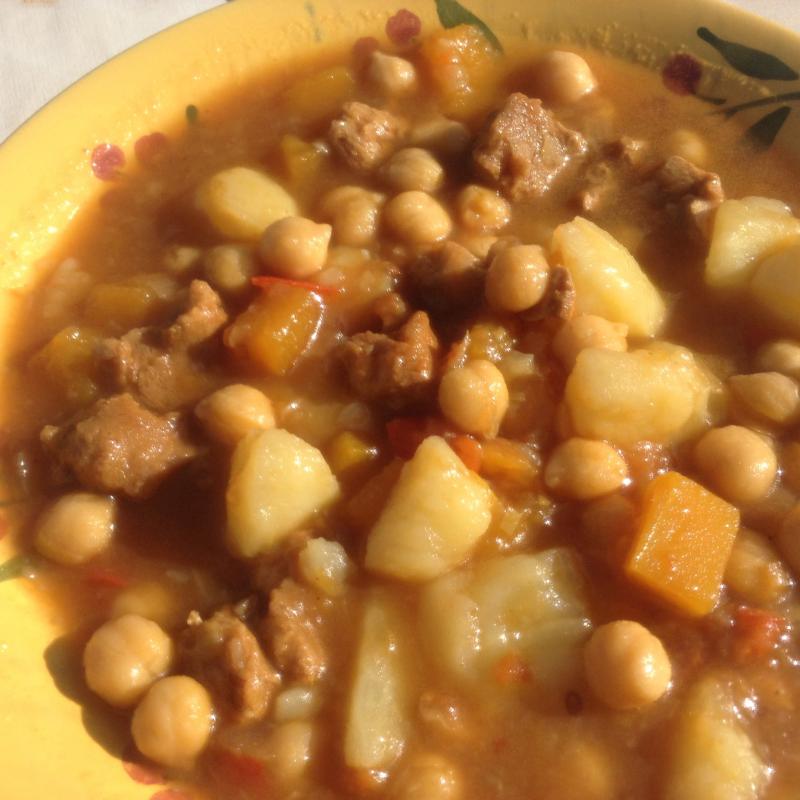 Iñaki, of course, un plato de cuchillo y tenedor ni lo contempla :lol:, así que el cordero pa nosotros, y para el este estupendo potaje de garbanzos, patata, calabaza, puerro, pimiento... y soja texturizada