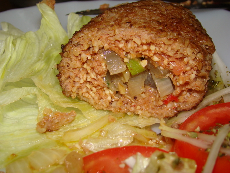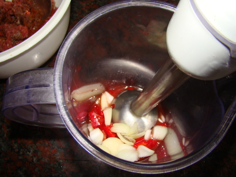 300 gr de carne picada, 150 gr de trigo burgol, 1/4 cebolla, 1/2 pocillo de puré de tomate,1/4 de pimiento rojo, 1/2 cdita de pimienta, 1/2 cdita de comino, 1/2 cdita de pimentón, 1/2 cdita de ají molido, 2-4 hojas de menta fresca. Aceite c/n.