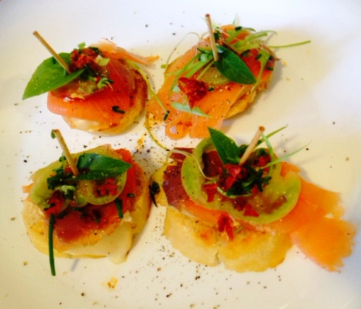 Capas: Pan baguette, queso scamorza ahumado y derrerido/(aunque no se vea), salmón ahumado, cebollino, pimienta, rodaja de tomate verde de la huerta, y salpicaditos de fuet (trocitos muy pequeños)