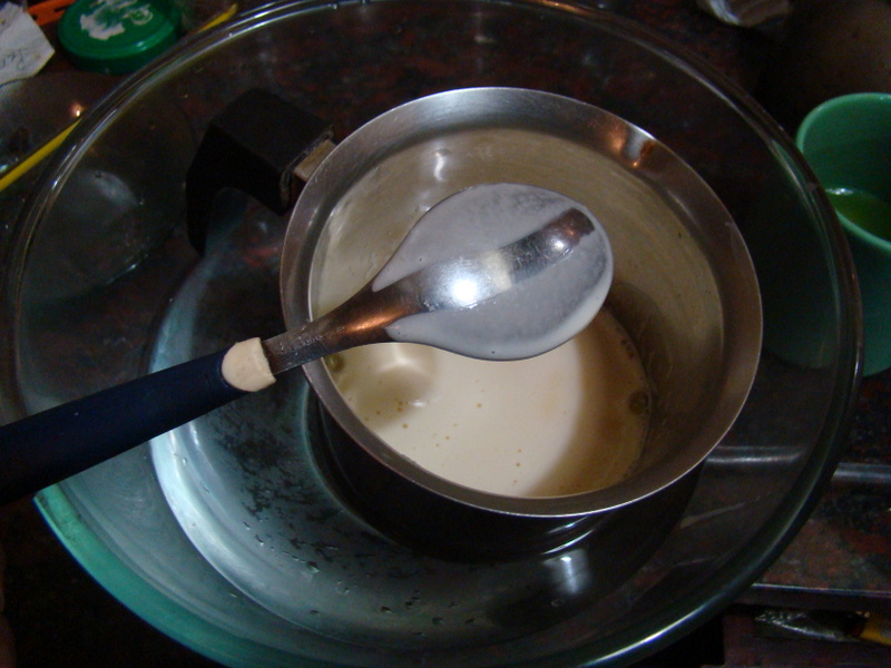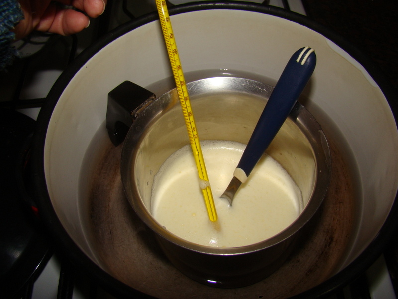 Pasar la mezcla de la leche con las yemas a una ollita con baño maría normal y calentar revolviendo todo el tiempo hasta alcanzar los 83ºC. Se debe controlar la temperatura muy bien pues no se debe superar los 85ºC ya que se coagularán las yemas y se cortará la crema: