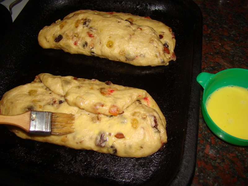 Como se ve en la fotografía siguiente yo los doble en 3 partes. Depositar los panes sobre una placa para horno con rocío vegetal y poner a leudar nuevamente unos 30 minutos cubierta con un film sin pegarlo a la superficie del pan (es solo para evitar caída de polvo del ambiente y evitar que se seque la superficie de los panes). Prender el horno para que vaya tomando temperatura. Luego del leudado pintar la superficie con huevo: