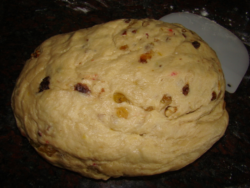 800 gr de harina, 50 gr de levadura fresca o 1 sobre de levadura seca de panadería, 200cc de leche, 200 gr de azúcar, 1 cda de miel, 300 gr de mantequilla, 3 huevos, 450 gr de frutos secos (100 gr de pasas rubias,100 gr de pasas sultaninas, 100 gr de fruta abrillanda, 50 gr de nueces, 100 gr de almendras), 1 cdita de especias para pastelería (1/2 cdita de cardamomo y 1/2 cdita de canela molida o bien 1 cdita sola de canela en polvo), 1 pizca de sal,  1 cda de esencia de vainilla, 1/2 cdita de esencia de pan dulce, ralladura de piel de 1 limón o naranja, 1 copita de ron.