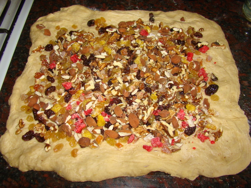 Esparcir la masa sobre una mesada enharinada y agregar los frutos secos.
