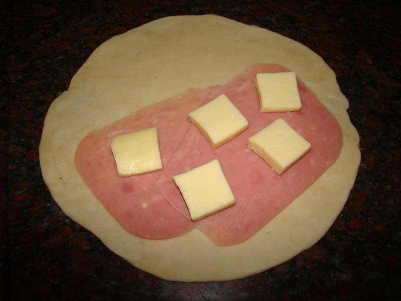 Colocar dos fetas de jamón cocido o paleta y cinco trozos de queso fresco en la mitad del disco dejando un pequeño borde libre para el cierre. Luego se doblará el disco y se procederá a cerrar como una empanada: