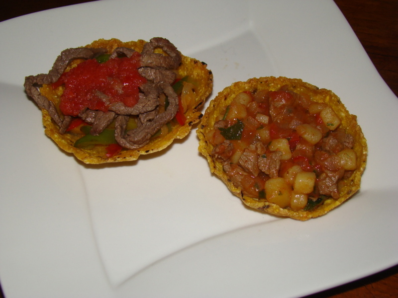 Generalmente en el cuenco se ponen carnes, salsa verde o roja, cebolla, papa, etc. resultando un plato muy rico pues la textura crocante del maíz con los sabores del relleno es un regalo para el paladar.