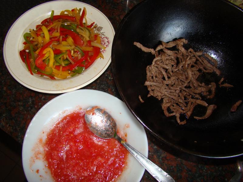 Masa de maíz nixtamalizado y relleno a gusto. Aquí se muestra un salteado clásico de vegetales, carne vacuna y salsa de tomates roja, y en la siguiente fotografía en la parte izquierda se ve un guiso picantito que está en una olla de hierro: