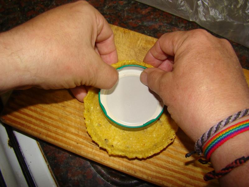 Moldear la tortilla en caliente con las manos, utilizando como molde una taza o una tapa o cualquier recipiente del que se quiera copiar la forma, en la fotografía siguiente se utilizó un jarrito enlozado. Esta tarea hay que hacerla con la tortilla recién hecha pues si se endurece se quebrará al querer darle forma: