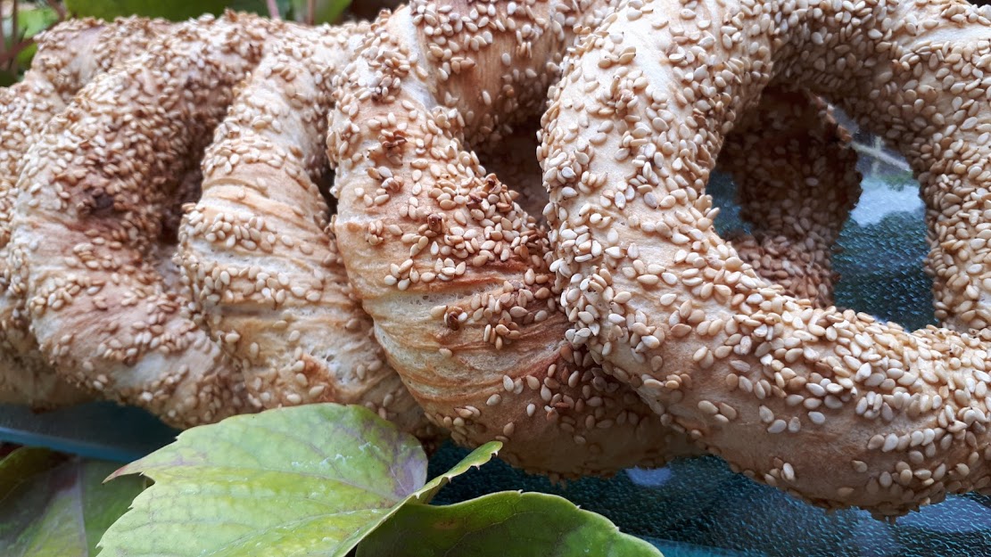 En Turquía se llama simit, en Grecia, kuluri y en Bulgaria gevrek. Es una especie de rosco, que se sumerge en petmezi o pekmez (entiéndase, mosto de uva dulce y espeso) y luego se reboza generosamente en semillas de sésamo. Yo como no tenía mosto, hice un jarabe de azúcar  moreno y obtuve un resultado muy pero muy parecido.