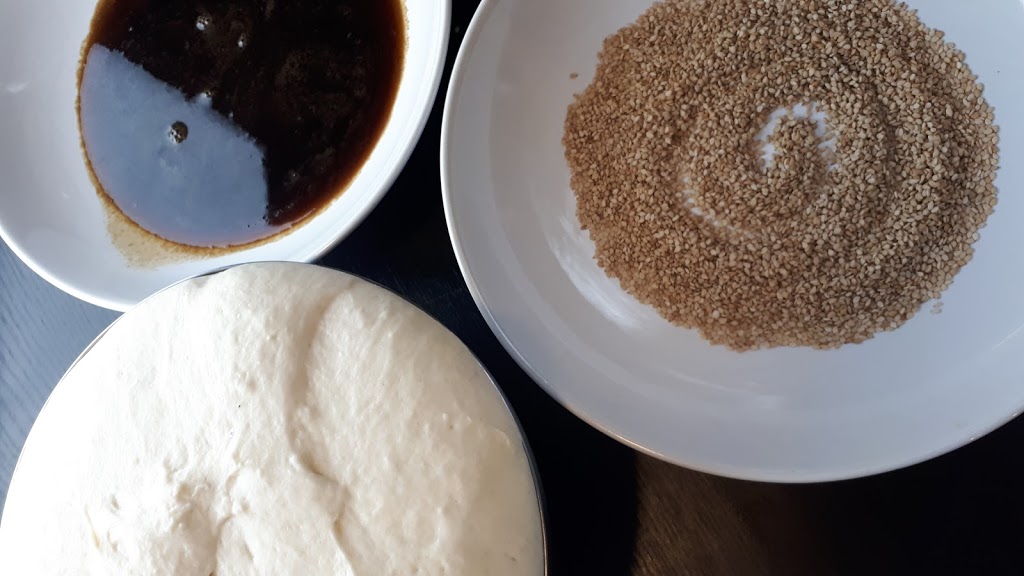 Ahora ponemos en un plato el sésamo, en otro el jarabe y volcamos la masa sobre la mesada.