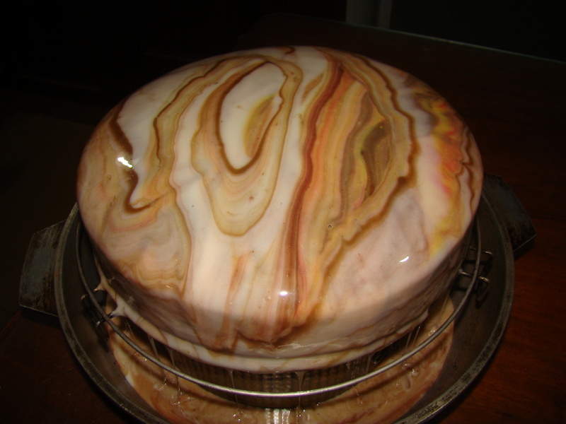 La receta de este baño espejo intenta imitar un falso acabado con el aspecto de un mármol en la gama de tonos del marrón. Tomé una receta base existente en muchos sitios de la red, la que publico en éste post específicamente es parte de la receta de la torta mirror publicada por Bake Off, me pareció excesivo tanto el volumen de la masa para la cobertura, como la cantidad de glucosa, por lo que bajé la cantidad de glucosa y ajusté el volumen total del baño a las necesidades de un pastel normal, pues para cubrir la superficie no es necesaria tanta cantidad, que luego se desperdicia o hay que estar agudizando el ingenio para aprovechar el sobrante. La comparto con mis lectores a efectos de aportar algunos tips para facilitarles la tarea y asegurar un éxito en la decoración. Sin duda que el lector puede modificar los colores a gusto e imitar otras piedras con presentaciones a gusto. También esta receta sirve para baños monocromos y hasta con agregado de brillantina comestible.