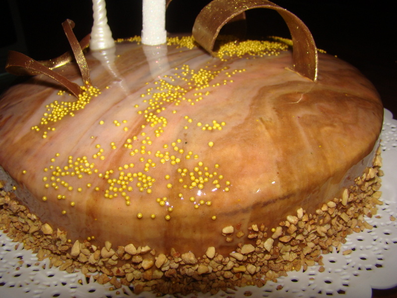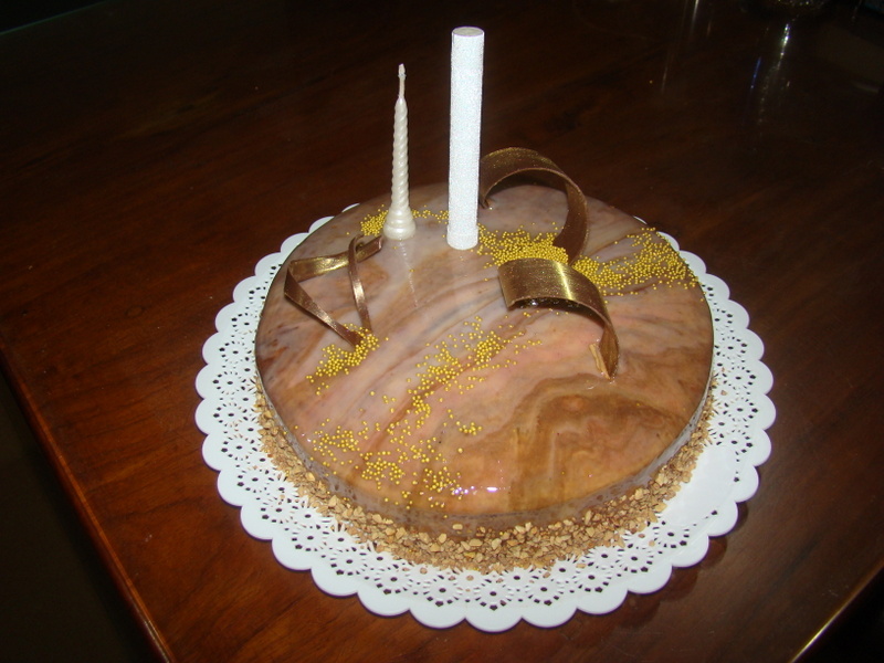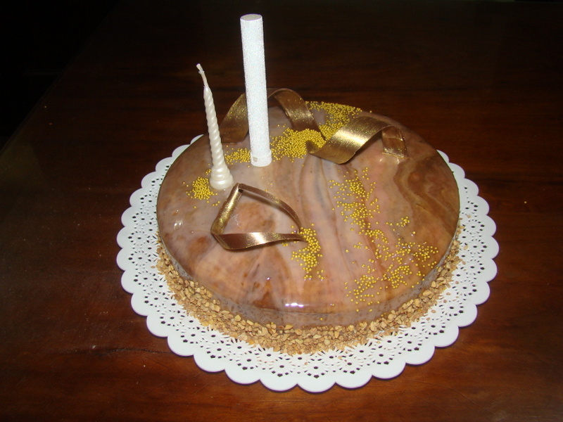 En la siguiente fotografía se puede ver como se decoró el pastel de cumpleaños con granas doradas y un rulo de chocolate pintado con polvo de oro simulando una cinta de raso: