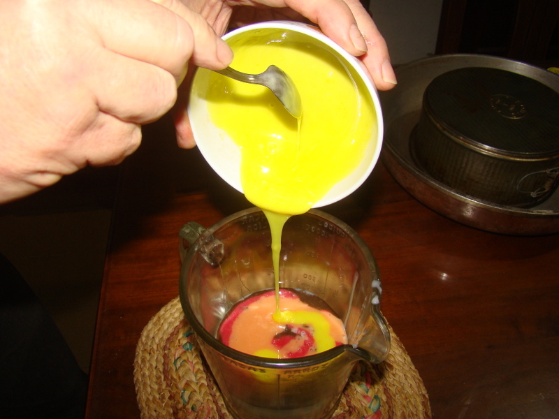 Pasar la mezcla a una jarra que permita luego el vaciado sobre la superficie de la torta, proceder a agitar con la turbina del mixer apoyada en el fondo del vaso para no incorporar aire a la mezcla, luego con pequeños movimientos se levanta la turbina y se vuelve  bajar sin llegar nunca a la superficie: