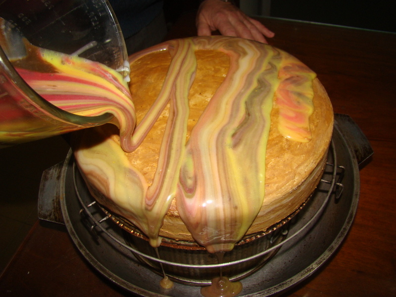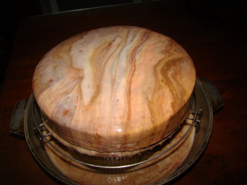 Volcar el baño sobre la torta helada recién sacada del freezer y puesta sobre una rejilla elevada (yo usé una cintura de molde con un diámetro más chico que el de la torta) y un recipiente para recoger el baño sobrante. Comenzar dibujando algún patrón lineal imitando las vetas de una piedra como se ve en la fotografía siguiente: