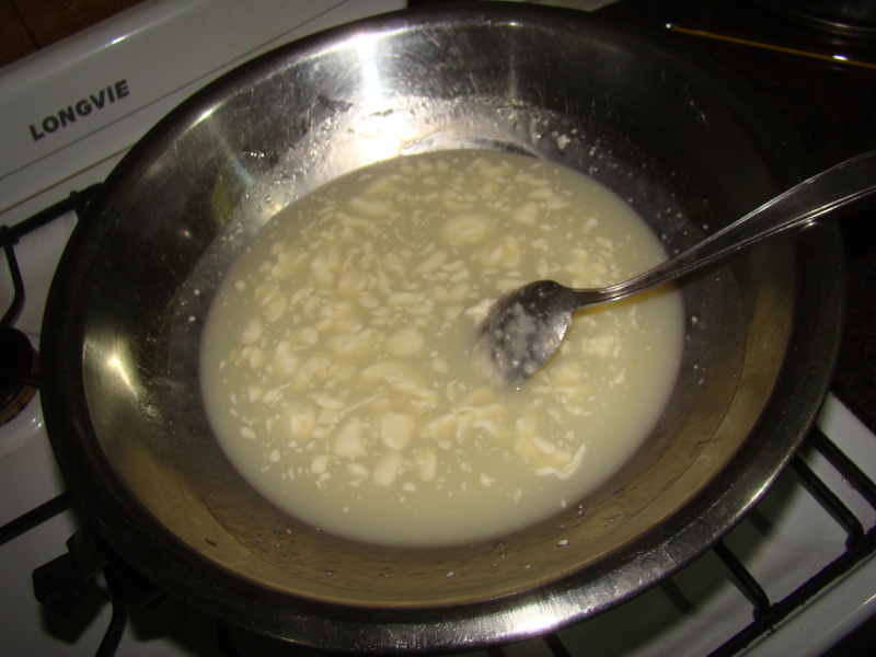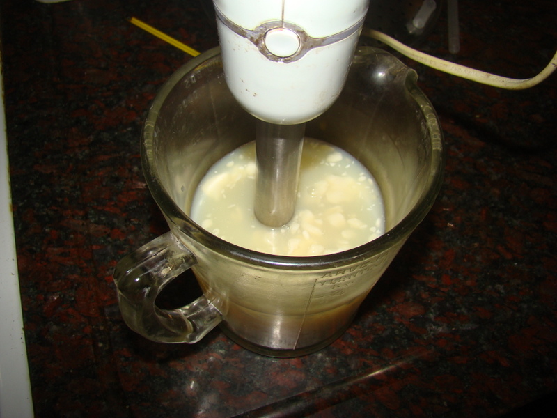 Agregar la leche condensada al chocolate blanco fundido y revolver. Veremos que la emulsión no se produce completamente por lo que para homogeneizar tenderemos que agitar mecánicamente con vigor, para lo cual se debe realizar un turbinado de la mezcla: