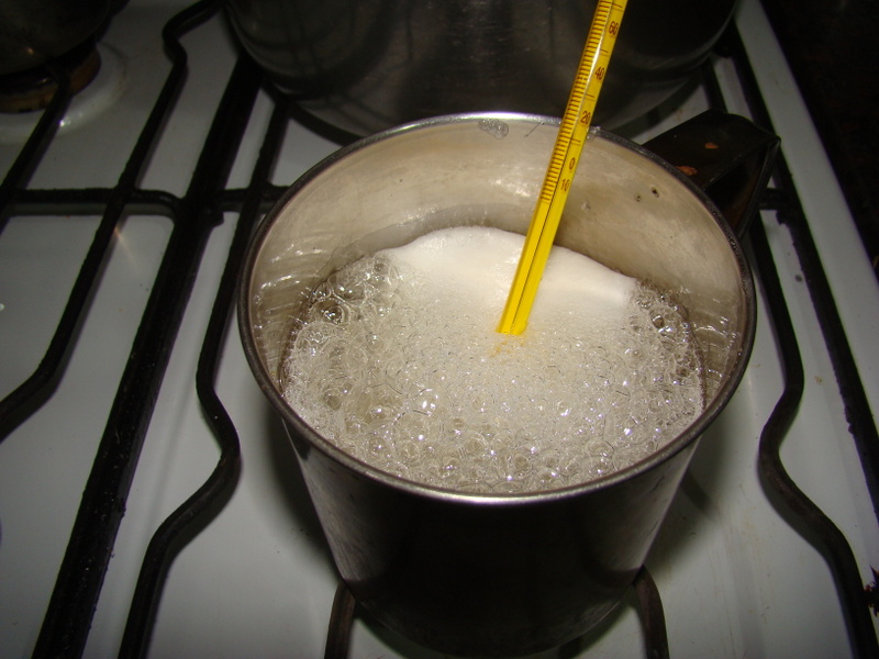 Hacer un almíbar con el azúcar, los 100 cc de agua y la glucosa a 103ºC, para ello mezclamos los tres ingredientes y ponemos a calentar hasta romper el hervor. Aquí veremos que apenas rompe el hervor y burbujea ya tenemos la temperatura necesaria (103ºC). Apagar el fuego y esperar un par de minutos a que la temperatura baje un poquito:
