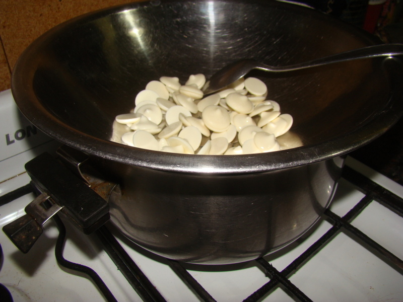 Fundir el chocolate blanco en un baño de vapor inactivo. Para ello se pone una olla con un poco de agua a hervir y cuando rompe el hervor se apaga el fuego y se coloca en un bowl el chocolate blanco a fundir. Se debe tener cuidado que el bowl no  toque el agua caliente pues se quemará: