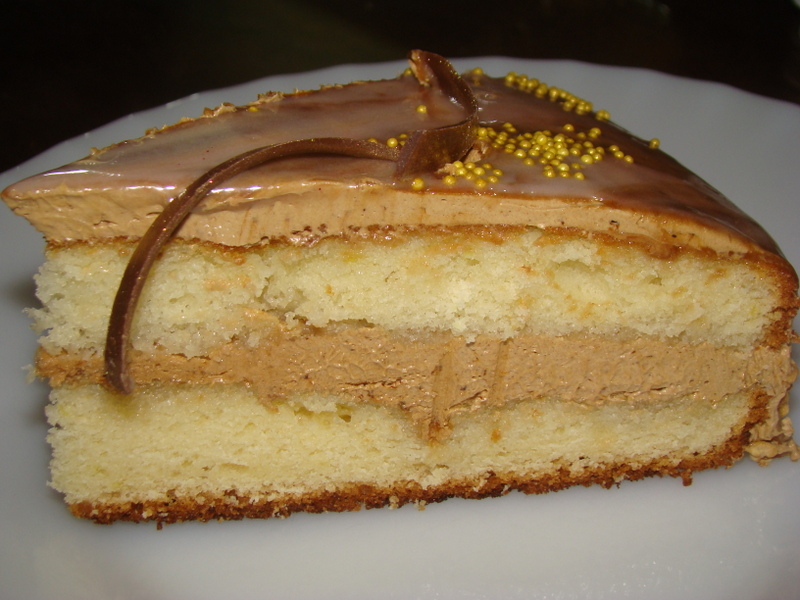 En la siguiente fotografía se ve que la cobertura es una lámina muy delgada sobre la capa de crema moka de arriba de la torta (tiene dos capas de crema moka : una al medio y otra arriba):