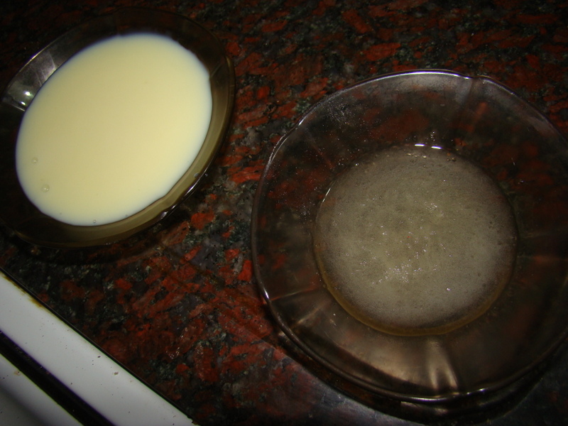A la izquierda la leche condensada y a la derecha se ve la gelatina ya fundida