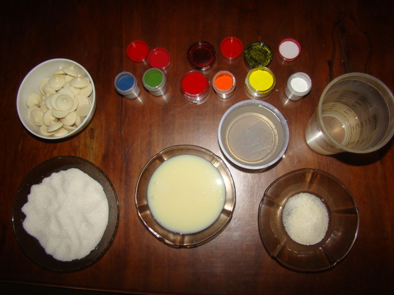 10 gr gelatina sin sabor, 100 gr de glucosa, 100 gr de leche condensada, 150 cc de agua (50cc para hidratar la gelatina y 100 cc para el almíbar), 150 gr de azúcar, 150 gr de chocolate blanco, colorantes en polvo liposolubles rojo, amarillo y naranja, 1 cda de cacao semiamargo en polvo.