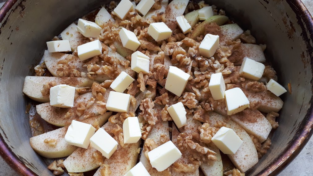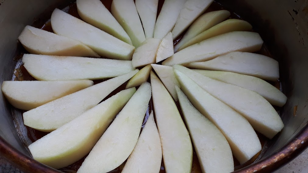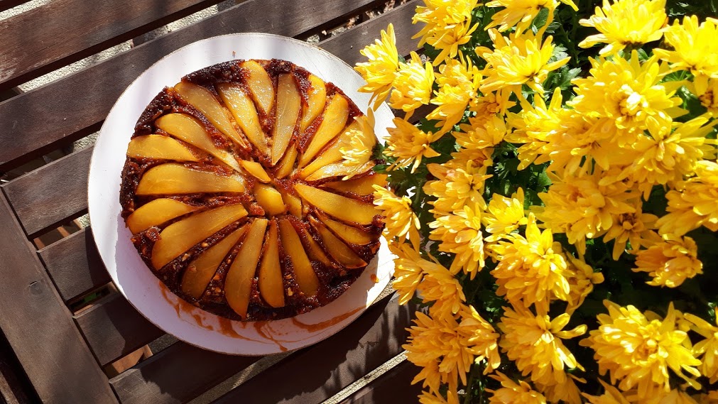 Tarta volteada, rápida, fácil y espectacular de peras (o manzanas) caramelizadas y nueces