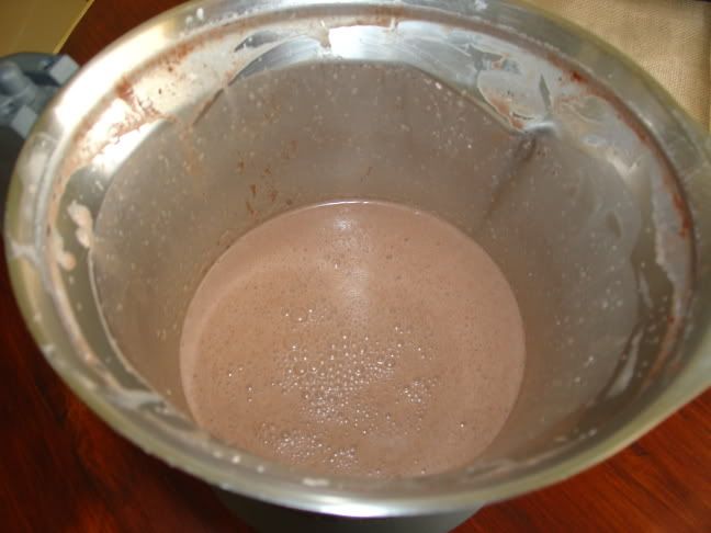 3.- Añadir el cacao, el queso, la nata, el azucar y los 250 grs. de leche . Mezclar 20