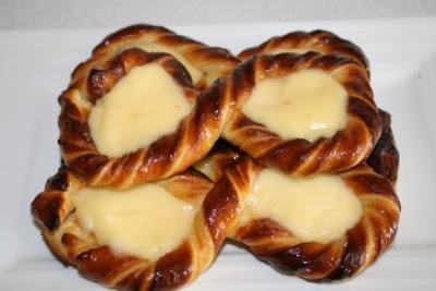Estiramos de nuevo formando un rectángulo, y cortamos tiras a lo largo, de un dedo y medio de ancho aproximadamente. Dejando un extremo de la tira de masa apoyado en la mesa de trabajo, giramos el otro extremo para ir enroscando la tira como se ve en las fotos. Formamos el lazo, y lo colocamos sobre una bandeja cubierta con papel sulfurizado. En los huecos ponemoos la crema pastelera que habíamos preparado previamente. Pincelamos con yema batida con un chorrito de leche, y horneamos durante 20 minutos a 180 º.