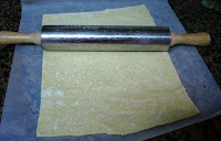 Como el hojaldre que utilicé era congelado, lo dejé descongelar y lo estiré con un rodillo bien finito, ayudándome con un poco de harina para que no se pegue al rodillo.