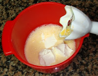 Por otra parte batimos los huevos, añadimos el mascarpone y 6 cucharadas soperas de azúcar y volvemos a batir y, por último, añadimos la leche y lo mezclamos bien.