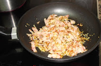 Cuando esté dorada, añadimos el beicon cortado en tiritas y, cuando este esté tostado, bajamos el fuego, añadimos la nata, un poco de sal y la mitad del Avecrem. Mezclamos.