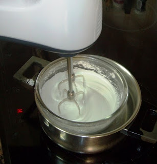Ponemos un recipiente al baño maría y dentro la clara de huevo, el azúcar y el agua, lo batimos con las varillas durante 7 minutos (sin parar). Ahora tendrá un color blanquecino, retiramos del baño maría y dividimos en varios recipientes, cada uno será un color diferente.