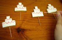 Cortamos las galletas. Para las de forma de pastel lo he cortado a mano y después he introducido un palillo en la base para poder clavar en el cupcake después. Las otras las he hecho con un cortagalletas, se pueden hacer redondas, cuadradas, etc. yo escogí esta forma para luego pintarlas y poner el número de años que cumplía la persona a quien se lo iba a regalar.