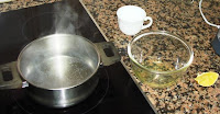 Preparamos el royal icing. Ponemos un recipiente al baño maría y dentro la clara de huevo, el azúcar, el agua y el chorrito de limón.