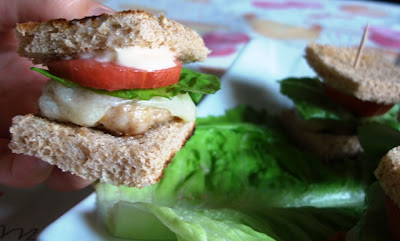Vale, ahora sólo falta montar cada bocadito. Esto va así, trozo de pan, mini hamburguesa con el queso derretido encima, trozo de lechuga doblada por la mitad, rodaja de tomate, chorrito de mayonesa y el trocito de pan que hará de tapa, para que no se nos desmonte pinchamos un palillo.